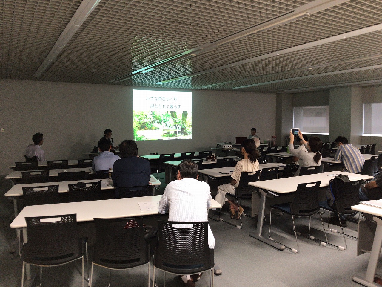 持続可能な社会は今世紀最大の地球上のテーマであり、CO2の問題ヒートアイランド現象の緩和策、はいずれも緑・自然のはたす役割が効果的であり、そのために持続可能な社会と建築、気候変化、温暖化のメカニズムをまず考えてみましょう。そして生態系の変化を読み、美しい環境を整えていくのが建築家の仕事という趣旨にてコーディネーターの片倉が冒頭、利休居士、七則の「夏は涼しく」その中の涼一味という言葉からお茶の世界が与えてくれる環境を感受する生活の知恵のようなところに身近な持続可能へのヒントがあることを説明、身体の延長に、住まいがあり、周辺環境があり、また地形を読みこみ住まいを考えていくことで、緑、水、光、風を考慮した調和のとれた外部空間・敷地全体のコンポジションを考えた住まいができ上ることを地方の理想的なお話として自作「丘水庵」を通して説明をさせていただきました。